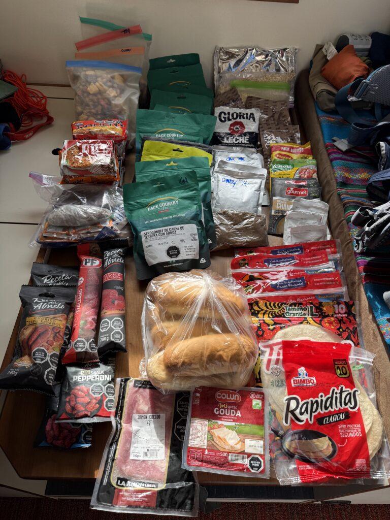 Dinners are mostly dehydrated meals—lightweight and, in theory, good (they’re from New Zealand, so expectations are high). Lunches are tortilla wraps with egg salad, ham, and cream cheese, pre-frozen to stretch shelf life. Hot chocolate for the evenings, tea and coffee for mornings, electrolytes for the day. No water filter needed—we’ll drink straight from the rivers.