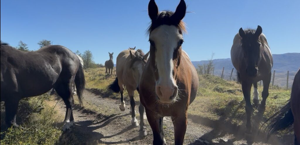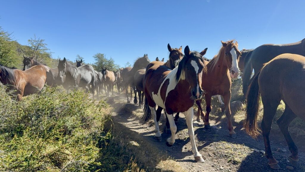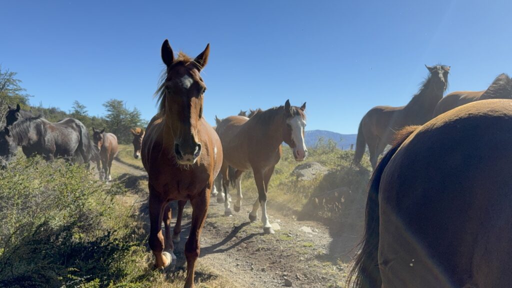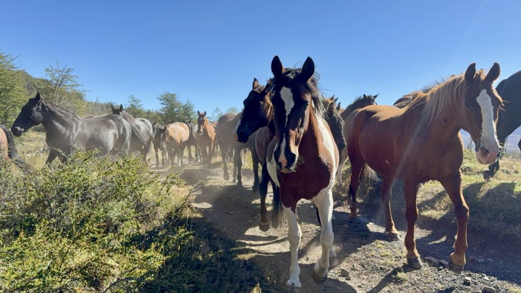 Winding around the hillside and through farmland, we suddenly encounter a herd of horses—dozens of them, loose and moving straight toward us. Big brown eyes, as curious about us as we were about them.