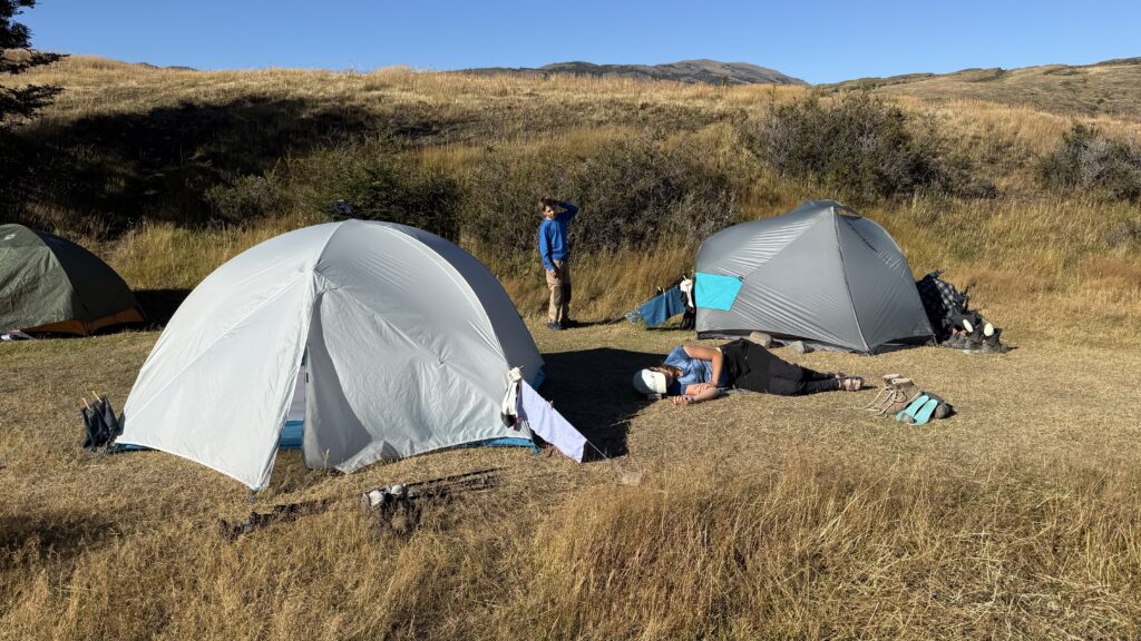 A hot shower feels like luxury. Later, we cook dinner in the mess tent and meet a mix of hikers: Sophie, walking solo from England; Jacquie and Greg from New Zealand, in shorts and every bit the part; a Chinese couple from Vancouver cooking a gourmet meal that makes ours look sad; and Petra and Armin from Germany, Experienced hikers in their mid-60s, camped beside us—soon to become our hiking buddies and friends.