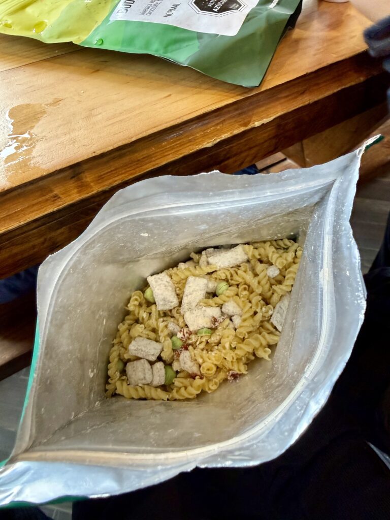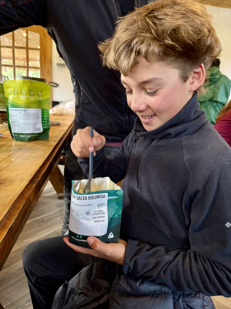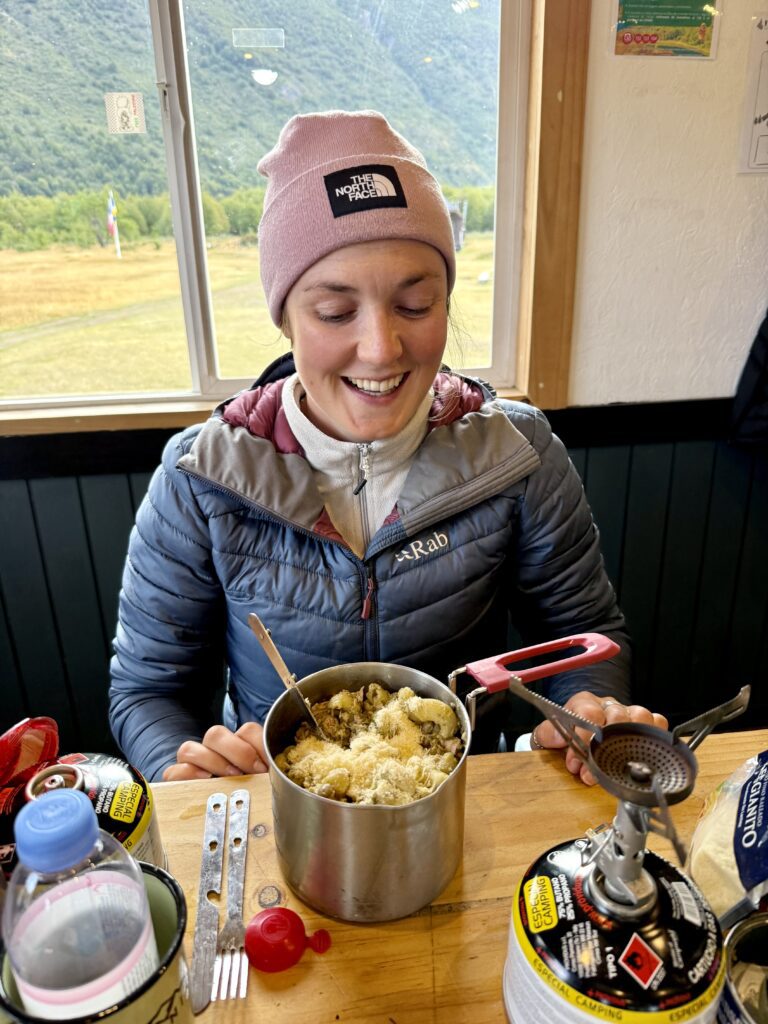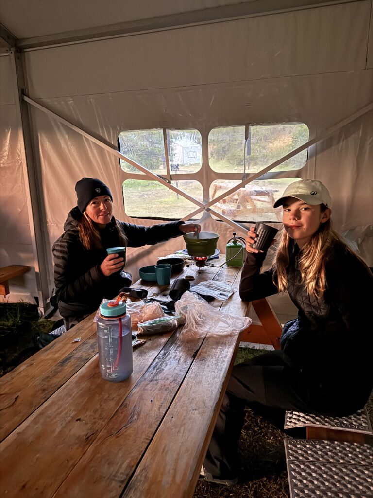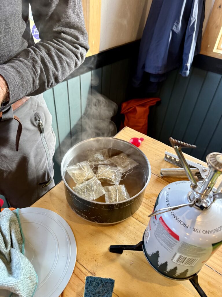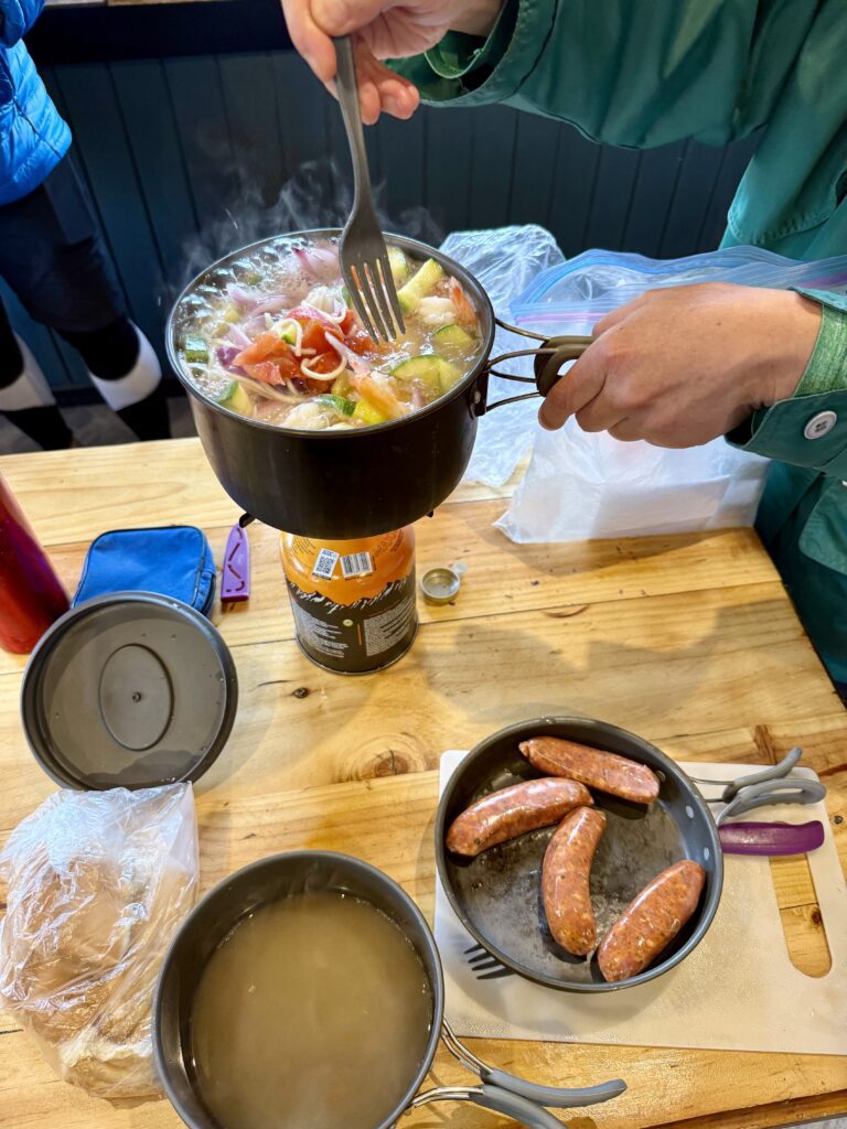 Everyone cooks in the communal kitchen — a requirement due to wildfire regulations, but one that turned out to be a highlight. These shared spaces are a way of bringing people together. Like us, the kiwi’s Jacqui & Greg with their dehydrated meals, Sophie with her mountain of food and the couple from Toronto, Frank & Jane once more cooked up a gourmet dinner, and generously shared a sausage with Jaxon. Petra and Armin from Munich, had couscous, soup, and their signature pot of tea. They’re the minimalists of the group. They pack what they need and nothing more, they have quiet confidence that comes from years in the mountains. We connected easily and enjoy many of the same sports.