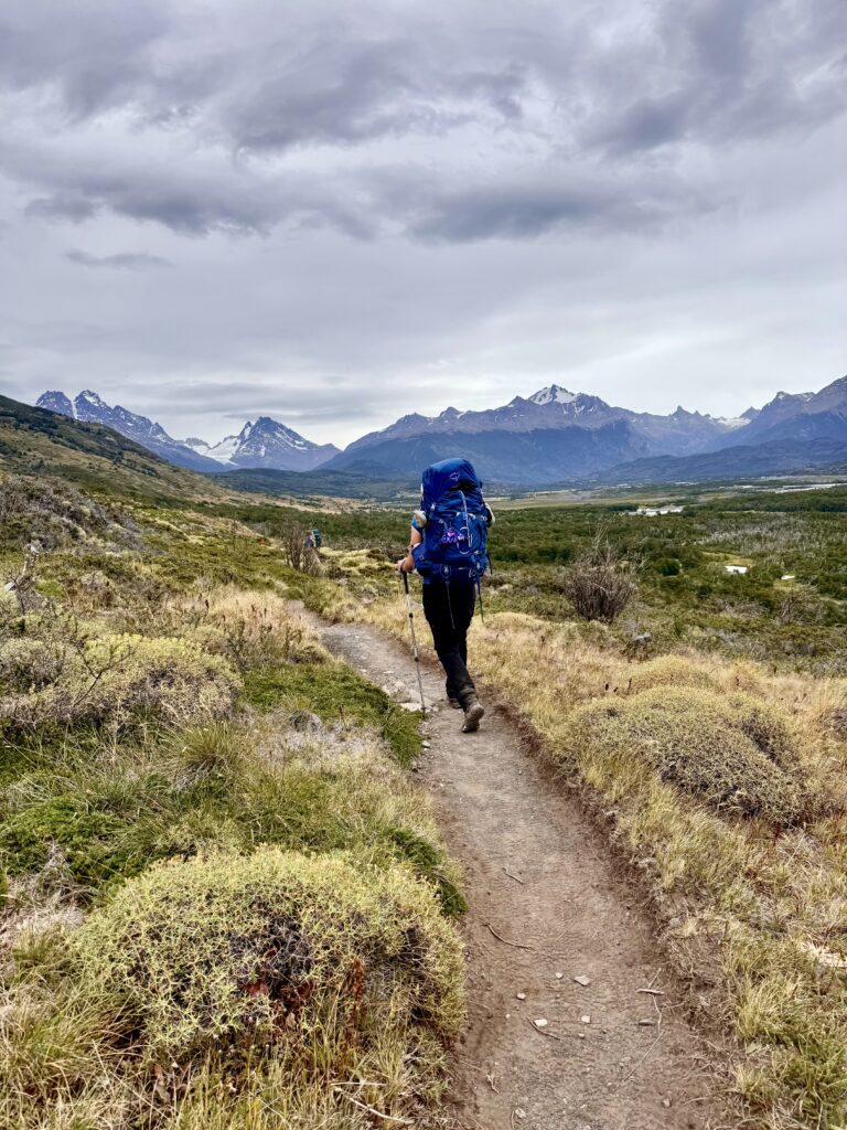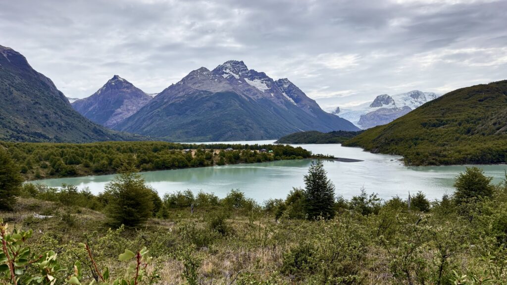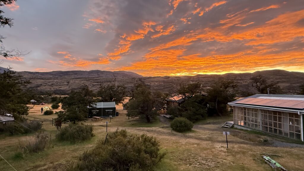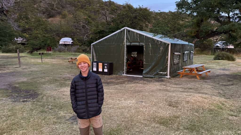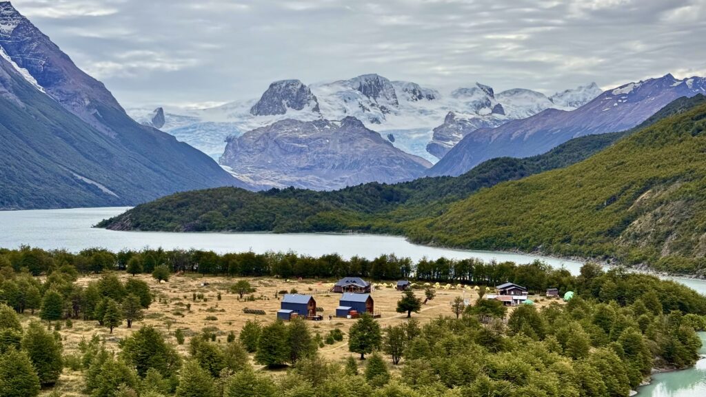 The campground itself is beautifully set — tucked among trees and grassy meadows, with views stretching toward Lago Dickson and the surrounding peaks. We wandered for a bit before finding a flat patch to pitch the tents.