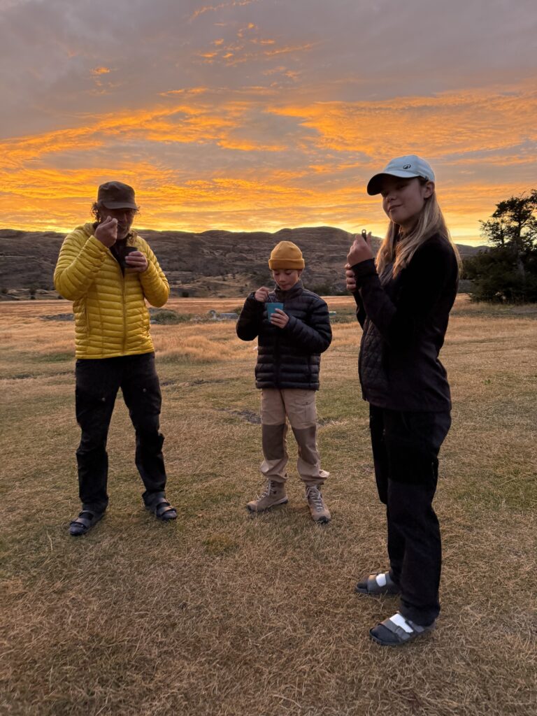 Bundled into down pants and jackets, we made our way to the mess tent, joining a handful of others already moving quietly through their morning. Outside, the sky began its slow transformation — soft strokes of pink and gold spreading across the horizon.