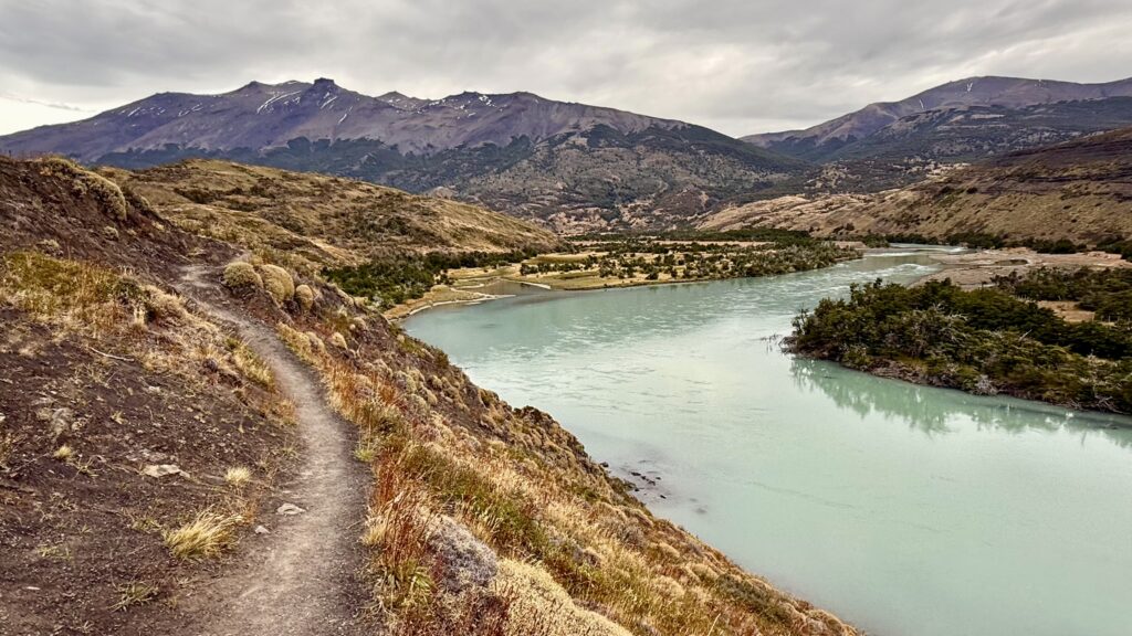 The landscape opened almost immediately into a wide, sweeping valley. Golden grasses stretched endlessly, broken only by a brilliant blue river winding its way along the valley floor. For long stretches, the trail simply followed its path — rising gently above it, then dropping back down to meet it again.